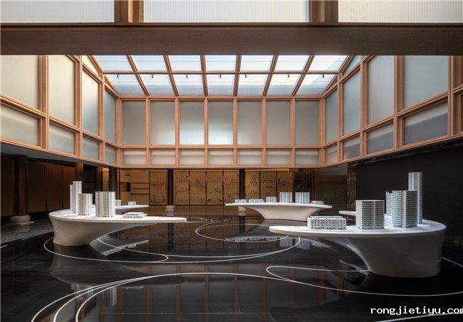洽谈区吊顶巧妙汲取古建屋檐之形,于室内呈现恢弘、尊崇的礼序。金色格栅则以15°斜角有序阵列延伸,勾勒出山廊叠影的诗画图景。